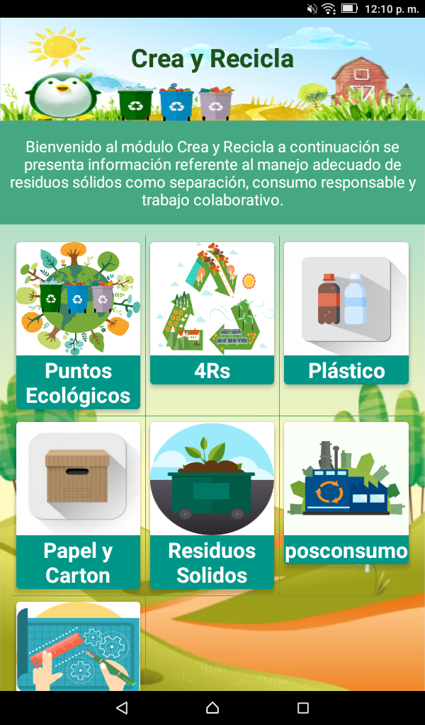 Contiene una serie de unidades a modo de enciclopedia o cartillas con interfaces interactivas, referente a temas del reciclaje y un manejo adecuado de residuos sólidos, de acuerdo al PRAE que se trabaja en la institución.