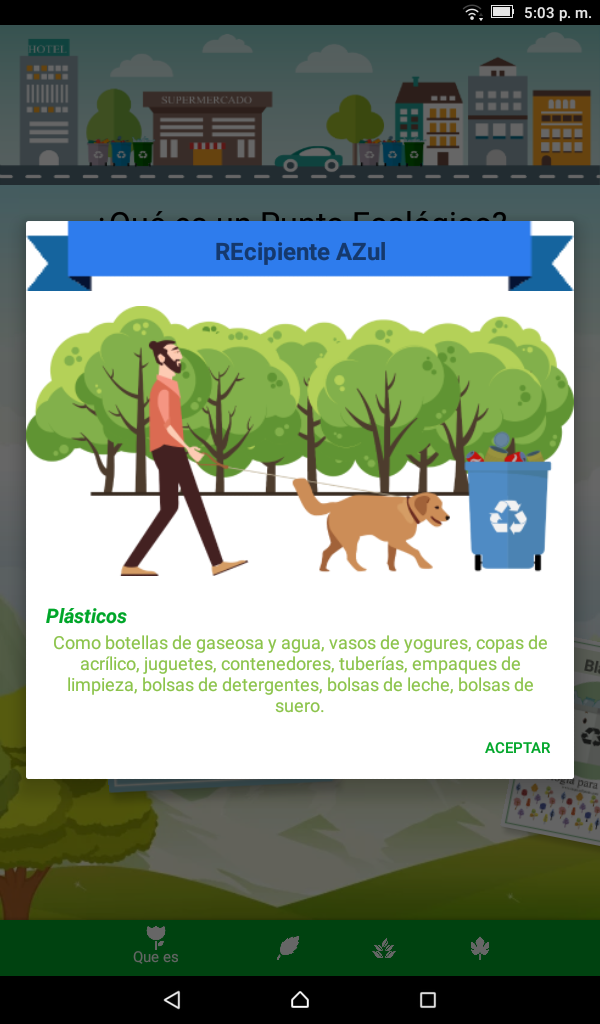 Aplicación móvil dirigida a niños y jovenes de las instituciones educativas del municipio de Pasto la cual permitirá concientizar y generar una cultura ambiental frente a aspectos de residuos sólidos y reciclaje.